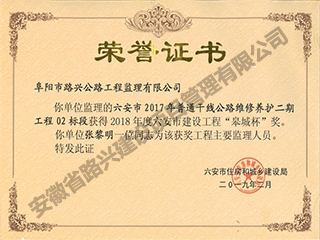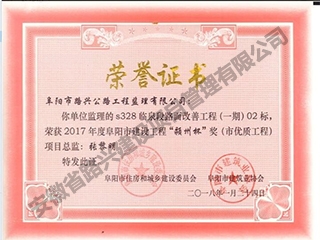 S328臨泉段路面改善工程02標(biāo)潁州杯榮譽(yù)證書