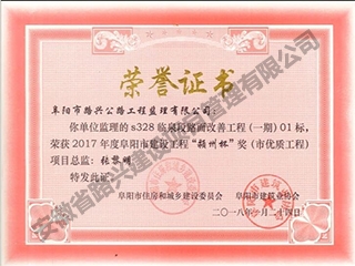 S328臨泉段路面改善工程01標(biāo)潁州杯榮譽(yù)證書