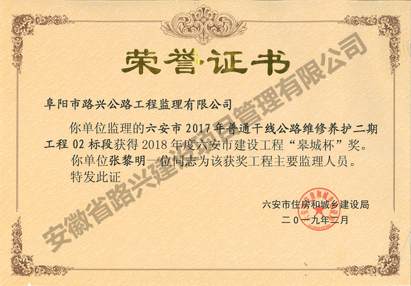S328臨泉段路面改善工程01標潁州杯榮譽證書