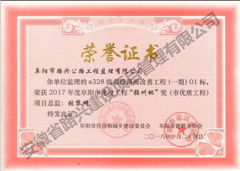 S328臨泉段路面改善工程01標(biāo)潁州杯榮譽(yù)證書